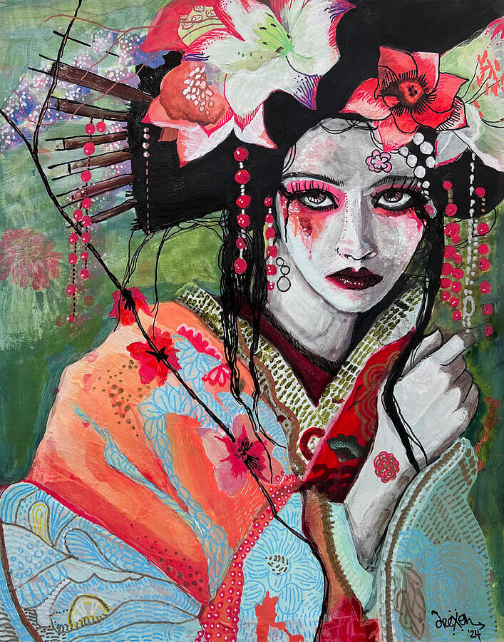 Haunted Yoshino is a portrait of a japanese courtesan (oiran) who’s haunted within the painting itself. Her red and white makeup is running. She wears bright flowers, hair pins and beads in her hair. Her gaze is direct, a little empty, a little sad. She wears a vibrantly patterned kimono. Acrylic, gouache, paint markers, ink.